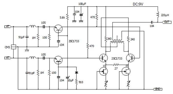 FM帯までできるだけゲインを上げるため入力のフィルター特性を変更しました。トランジスタをftの高い2SC1733へ変更し回路電流も見直しを行い電源電圧も1Vほど低く9Vに変えました。